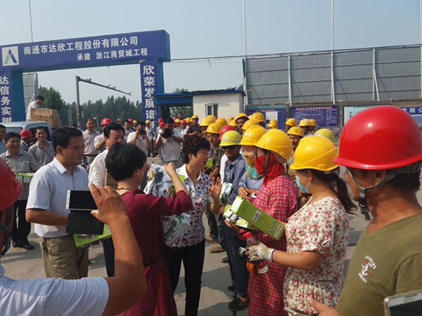 7月6日,第三、第十工程公司承建的邯鄲商貿(mào)城項目,迎來了邯鄲市委、市政府、市總工會組成的慰問團(tuán)。慰問團(tuán)一行向奮戰(zhàn)在施工一線的廣大干部職工發(fā)放了夏季慰問品??偣飨诂F(xiàn)場發(fā)表了熱情洋溢的講話,高度贊譽(yù)達(dá)欣是一支過硬善戰(zhàn)的施工隊伍,并勉勵全體參戰(zhàn)人員鼓足干勁,保證工程按期封頂,按期交工。
