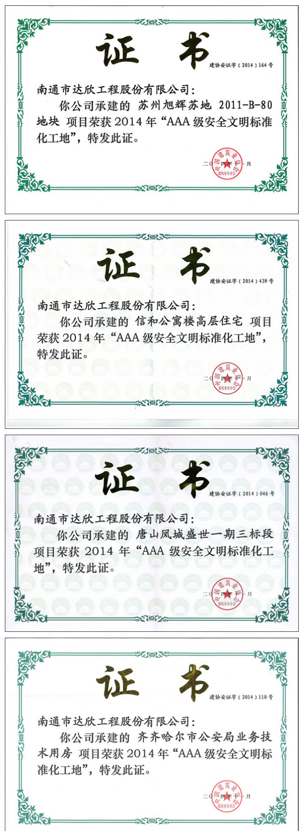 近幾年我公司獲得全國AAA級安全文明標(biāo)準(zhǔn)化工地16項,創(chuàng)建面涉及上海、江蘇、湖南、河北、黑龍江、新疆等市場,安全文明施工管理水平再上新臺階,榮譽的取得為進一步提升達欣品牌在全國各個市場的影響力,為進一步提升企業(yè)形象、促進企業(yè)長遠發(fā)展奠定堅實的品牌基礎(chǔ)。