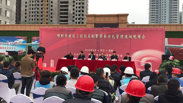 4月19日上午,邯鄲市建設(shè)局、公安局聯(lián)合在邯鄲高鐵站東側(cè)榮科佳苑項目舉行“邯鄲市建設(shè)工程實名制暨勞務(wù)分包管理現(xiàn)場觀會”。市公安局副局長梁海民、李強(qiáng)、市建管辦副主任連書民、市建管辦分包處處長郭長印、全市各區(qū)縣建設(shè)局主管副局長以及各建設(shè)、施工監(jiān)理單位負(fù)責(zé)人、勞務(wù)企業(yè)負(fù)責(zé)人等500多人參加會議。