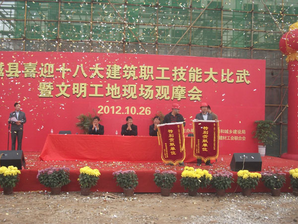 10月26日,由磁縣住房和城鄉(xiāng)建設(shè)局主辦,磁縣建筑建材工會(huì)聯(lián)合會(huì)承辦的“磁縣喜迎十八大建筑職工技能比武大會(huì)暨文明工地現(xiàn)場(chǎng)觀摩會(huì)”在寶盛世紀(jì)B區(qū)二期項(xiàng)目現(xiàn)場(chǎng)隆重舉行。邯鄲市住房和城鄉(xiāng)建設(shè)局建管處處長(zhǎng)袁中英、邯鄲市建管辦主任邢文革、磁縣副縣長(zhǎng)高強(qiáng)、磁縣住建局副局長(zhǎng)趙志彬、馮保民、張彥華等領(lǐng)導(dǎo)出席開幕儀式,第四工程公司邯鄲項(xiàng)目總指揮陳仁富陪同出席。