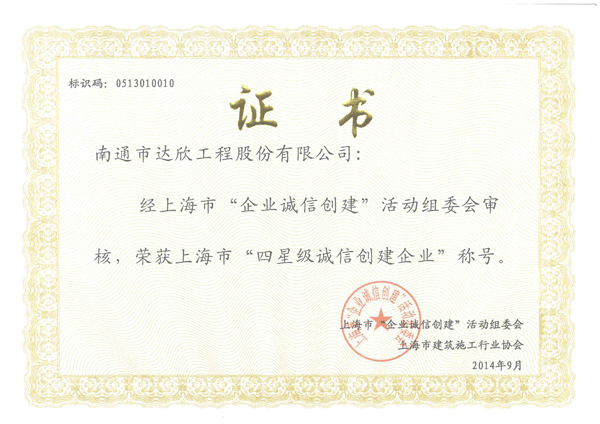第一工程公司榮獲上海市“四星級(jí)誠(chéng)信創(chuàng)建企業(yè)”稱號(hào)