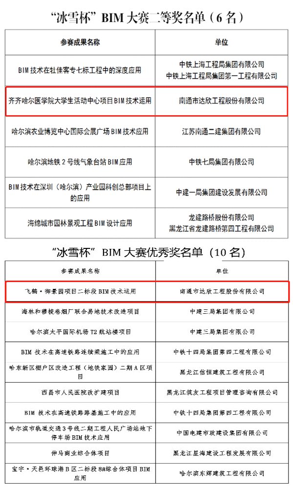 第七工程公司兩項目榮獲黑龍江省“冰雪杯”BIM大賽獎項