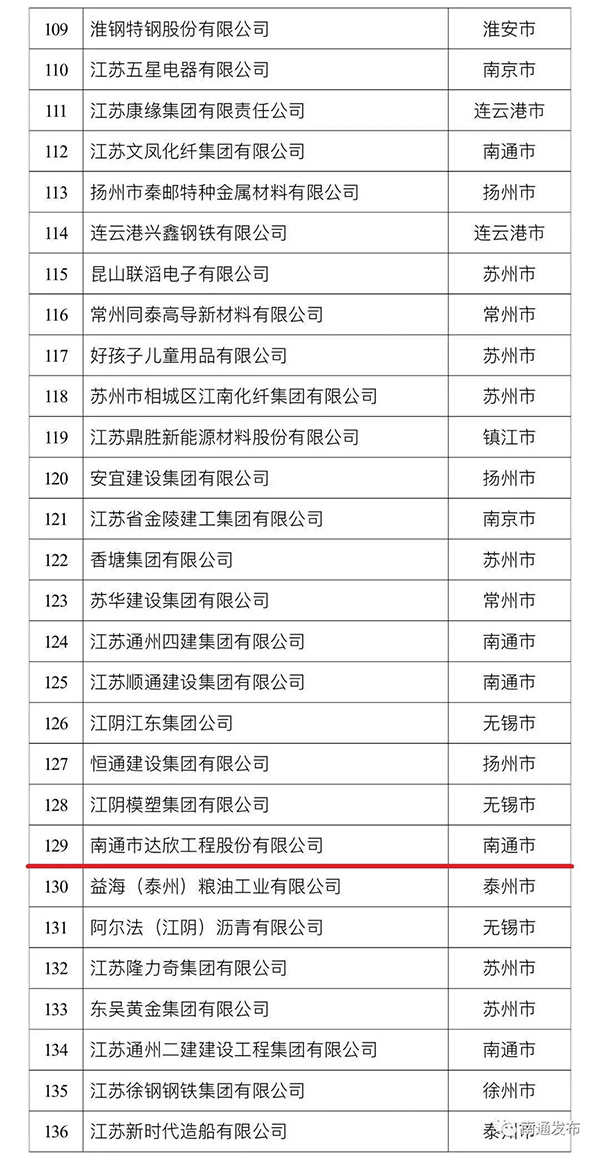 9月21日,由江蘇省工商聯(lián)發(fā)布的最新民營企業(yè)200強(qiáng)名單出爐。達(dá)欣集團(tuán)首次入圍,排位129位。本次南通民企入圍總數(shù)為32家,海安建筑企業(yè)3家。
