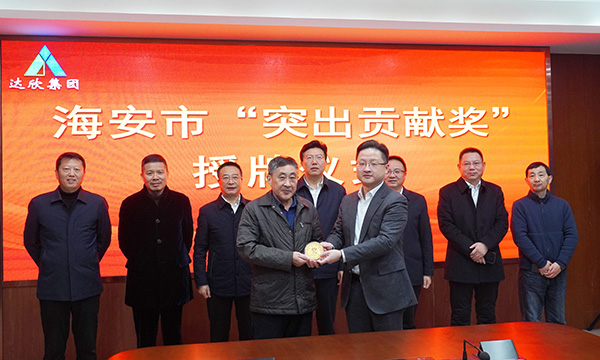12月1日,海安高新區(qū)黨工委書記鄧加忠,黨工委副書記、管委會主任魯斌,黨工委副書記、科創(chuàng)園主任陸建銀,管委會副主任徐愛軍等領(lǐng)導(dǎo),為企業(yè)“2021年度入庫稅金超億元”,舉行“突出貢獻獎”授牌儀式。這是繼去年集團榮獲此項獎牌后,再次受到當(dāng)?shù)卣挠忠淮渭为劰膭?。集團領(lǐng)導(dǎo)馬和軍、劉厚純等出席授牌儀式。