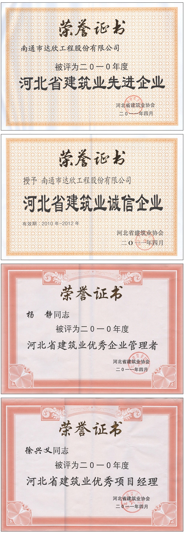 第四工程公司憑著多年的誠(chéng)信經(jīng)營(yíng)與良好的企業(yè)聲譽(yù),在本次會(huì)議上榮獲多項(xiàng)殊榮:“2010年度河北省建筑業(yè)先進(jìn)企業(yè)”、“2010-2012年度河北省建筑業(yè)誠(chéng)信企業(yè)”,楊靜同志榮獲“2010年度河北省建筑企業(yè)優(yōu)秀管理者”,徐興義同志榮獲“2010年度河北省建筑企業(yè)優(yōu)秀項(xiàng)目經(jīng)理”。